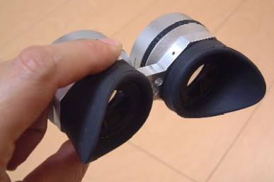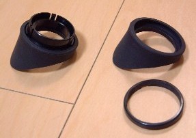 家族はメガネは掛けていないので裸眼用のツノ見口を取り付けました。余っていたニコン10X70用のゴム製のツノ見口がほぼピッタリ。ゴムだけでも付きますが、ツノ見口の接続樹脂リングを削って鏡胴にはめ込み外れ防止としました。 それと対物レンズ側のフィルタネジが銀色のままだったので黒色艶消しで塗装しました。