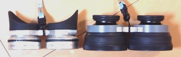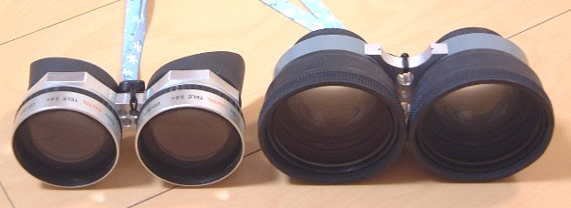 2つのテレコンBINOにおそろいの携帯ストラップをつけました。こうして並べるとニコンでつくったBINOは異様に大きい。星をみると肉眼二重星の分解力はニコンBINOが上ですが、地上の景色では差をあまり感じません。ちいさめケンコーBINOは230g、女性には負担にならない大きさだと思います。散歩でぶら下げても邪魔に感じない程度かな。一方の2倍近いニコンBINOの重さも星見用ならまあ良いかなと思います。