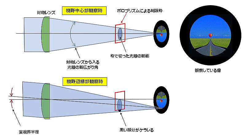 これは対物レンズや接眼レンズでのケラレ(ビネッティングといいます)によるもので、プリズムのケラレとは別物です。