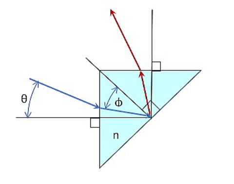 臨界角:φ(°)となる光線をさかのぼっていくと、プリズム入射面にある角度:θ(°)で入る光が臨界角を作っています。