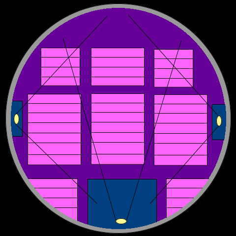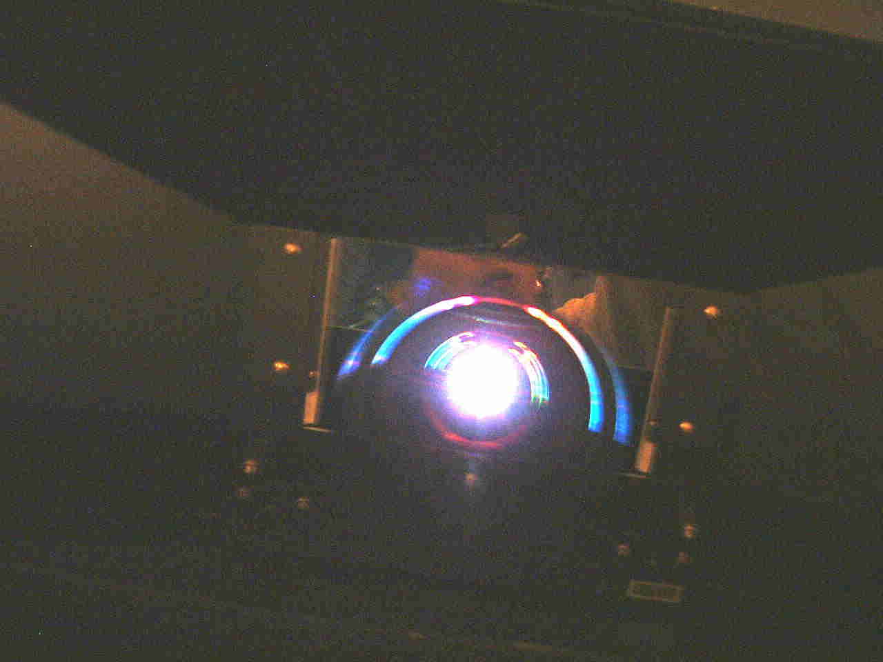 上は左右の投影レンズを覗き込んだ画像、直径10cmあまりの大きな魚眼レンズがこちらをにらんでいた。家庭用のプロジェクターとは異なり、白色光源でなく3原色のレーザーを使用している。小さく絞ったレーザーをスキャニングして画像を作るのだが、いままで見た「オムニマックス」などのフィルムを使用するものに比べても極めて尖鋭な画像だ。構造的にはレーザーの制御スピードを上げることによってさらに解像度を上げることも可能だろう。プラネタリウムの星像を見た感じではやはり鹿児島のケイロンのような光学式には及ばないが、昔の光学式程度の解像感(点像感)がある。ただ一つ不満なのはアンタレスなどの赤い星の星像で、RGBのGBの割合が減るためそのまま暗く投影されてしまっていた。投影ソフトで改良できないのだろうか?後述の「銀河鉄道の夜」で表現された星野はCGアートによるものだがむしろこちらのほうが美しかった。