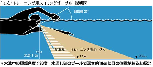 ミズノの「トレーニング用ゴーグル」 ご覧のとおり前面レンズが大きく傾斜しているのが最大の特徴だ。