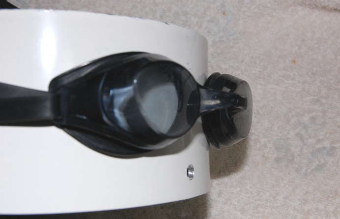 入手したとき、周囲のゴムが無かったのでびっくりすると同時にガッカリしたのだが、使ってみるとより前方視野を確保するにはゴムなどは無いほうがよい。透明樹脂が直接目の周囲の柔らかい皮膚に当たるのでヒモのテンションとか目幅調整用のパーツ(下図)をうまく調整しないと水が入ったり、目が痛かったりする。